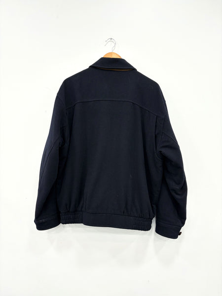 Veste bleu marine en laine et cachemire Pierre Cardin Sport vintage, fermeture zippée, simple boutonnage avec poignets et bas élastiqués.
