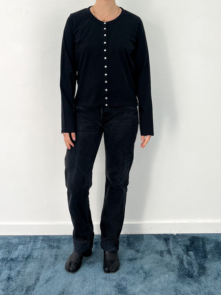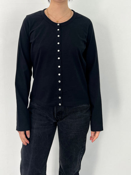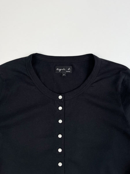Cardigan noir en jersey Agnès b., fermeture pressions nacrées, boutons de serrage,