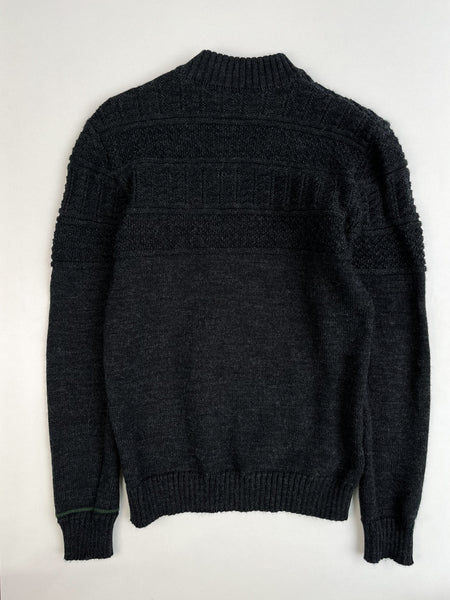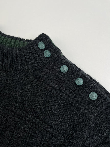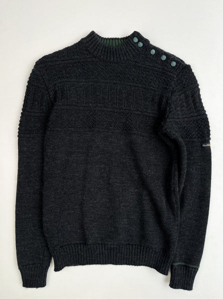 Pull marin gris en 100% pure laine, coupe près du corps et des jeux de maille qui rappellent les tricots de marins pêcheurs, et un col remaillé. Fabriqué en France.