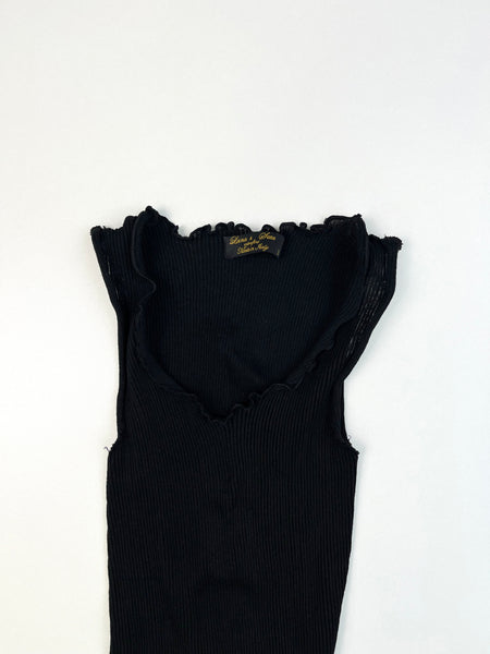 Top en laine et soie noir vintage, tissu côtelé extensible,