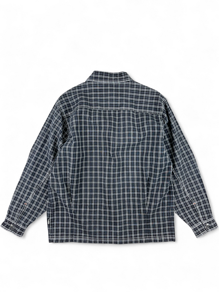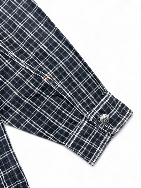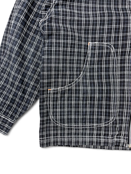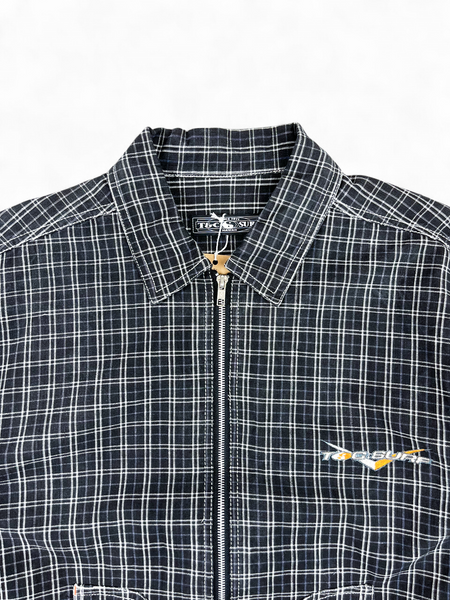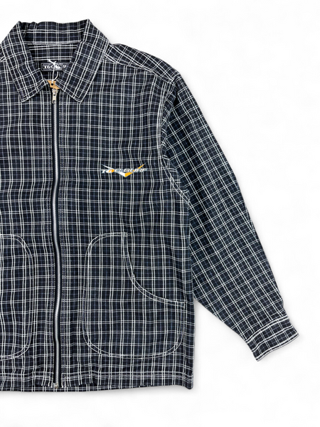 Veste en coton noir à carreaux blanc et violet T&C vintage, fermeture éclair, deux grandes poches arrondies.
